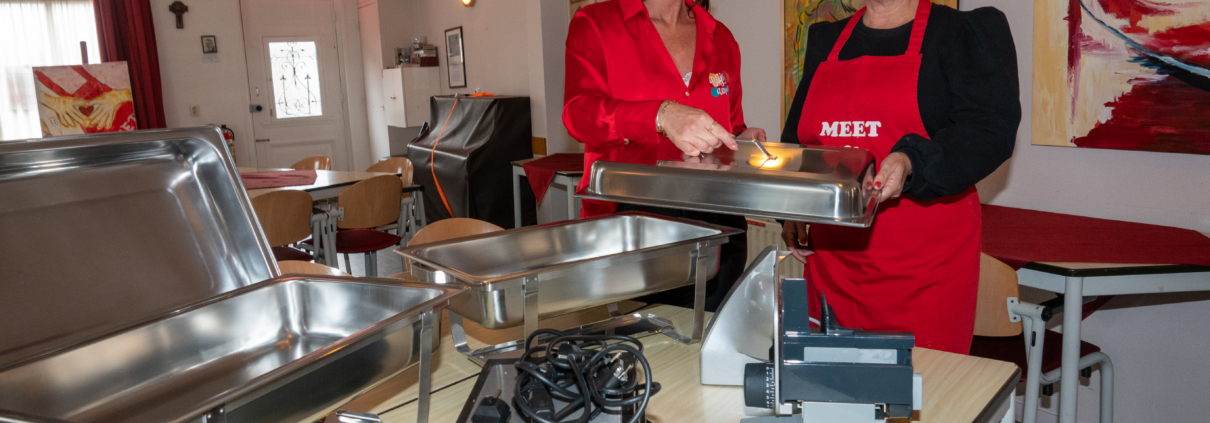 Al ruim 4 jaar zorgt stichting Meat & Eat Uitgeest er voor dat alleenstaande en oudere dorpsgenoten drie keer per week gezellig kunnen aanschuiven. Zij verzorgen in de Slim en de Klop heerlijke driegangen diners. Tijdens het eten komen de Uitgeesters gezellig met elkaar in contact. Iets wat heel belangrijk is, als je heel regelmatig alleen bent. De stichting doet dit nu al een flinke tijd met veel succes. Maar om het allemaal net iets eenvoudiger te maken en het eten langer lekker te houden, hadden zij behoefte aan wat nieuwe spulletjes. Met de mooie warmhoudmiddelen en een elektrische snijmachine kunnen zij alle gasten iedere keer weer een lekkere en warme maaltijd voor zetten. Eet smakelijk!
