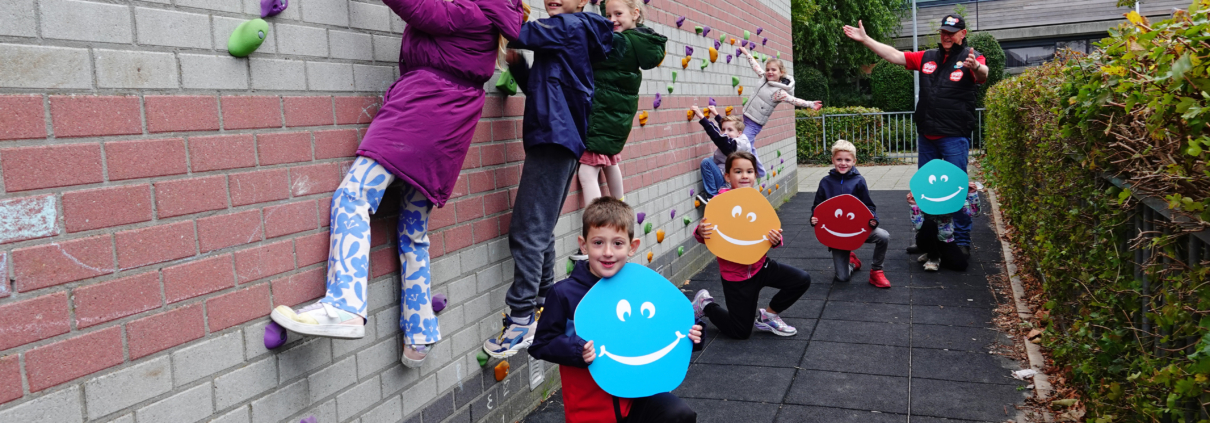 Wat zijn de kinderen van De Wissel blij met hun nieuwe klimmuur! Met een sponsorloop hebben ze zelf een flink bedrag bij elkaar gebracht. Met plezier heeft Blijer Uitgeest het restant bijgelegd, zodat de muur aangeschaft kon worden. Er liggen rubberen tegels onder. Dat is slim en veilig, want dan val je niet zo hard. Veel klim plezier samen!